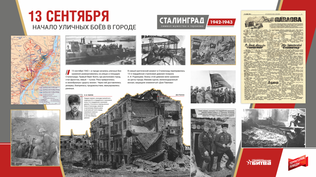 В самый критический момент в Сталинград переправилась 13-я гвардейская стрелковая дивизия генерала А. И. Родимцева. Воины этой дивизии вели сражения за центр города, Мамаев курган, железнодорожный вокзал, защищали знаменитый «Дом Павлова».