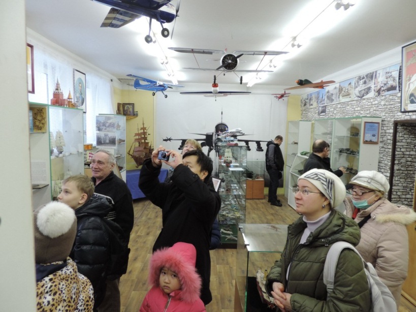 В музее «Город и авиация» гости рассматривали фотографии героев-летчиков, стенды, посвященные истории города Жуковского, 45-й Авиационной дивизии дальнего действия, летчикам ЛИИ-участникам Великой Отечественной войны, участию Русской Православной Церкви в Великой Отечественной войне, диораму Рейхстага, фотографии и модели самолетов и многие другие экспонаты музея и даже смогли посидеть в настоящем кресле пилота за штурвалом самолета, сфотографировались у космического челнока «Бор-4».