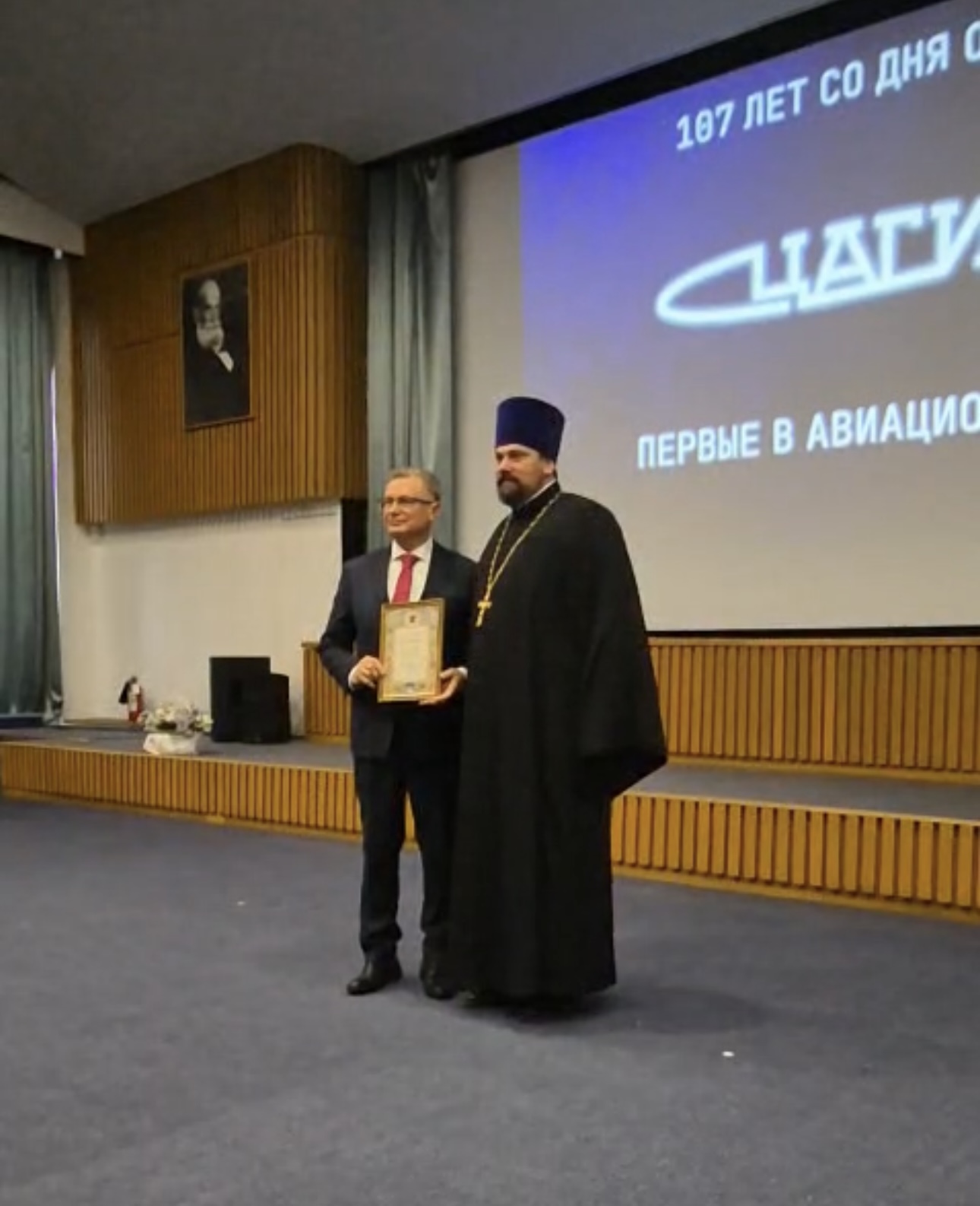 Отец Димитрий передал Генеральному директору ФАУ «ЦАГИ» им. проф. Н.Е. Жуковского», член-корреспонденту Российской Академии наук Сыпало Кириллу Ивановичу и вице-президенту Российской академии наук, научному руководителю ФАУ «ЦАГИ им. проф. Н. Е. Жуковского»Чернышёву Сергею Леонидовичу благодарственные грамоты митрополита Крутицкого и Коломенского Павла, патриаршего наместника Московской митрополии за многолетнее сотрудничество и помощь храмам Коломенской епархии.